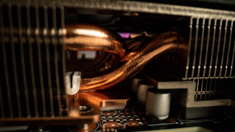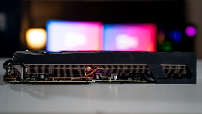 As we’ve already mentioned, the backplate sees several cutouts that allow the air to pass through the card more freely, ultimately providing better heat dissipation and efficiency. A large copper plate & several copper heat pipes can be found weaving their way through the aluminum heatsink fins. The copper plate comes into direct contact with the GPU and VRAM, redirecting heat via the copper pipes in a very efficient manner.