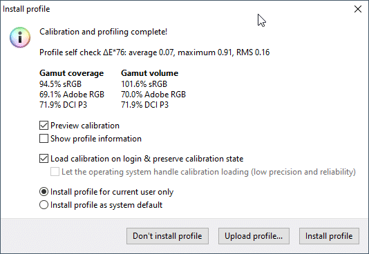 | Calbirated User Profile | 6484K | 0.0604 cd/m² | 1998.6:1 | 0.24 | 1.28 | 2.21 |