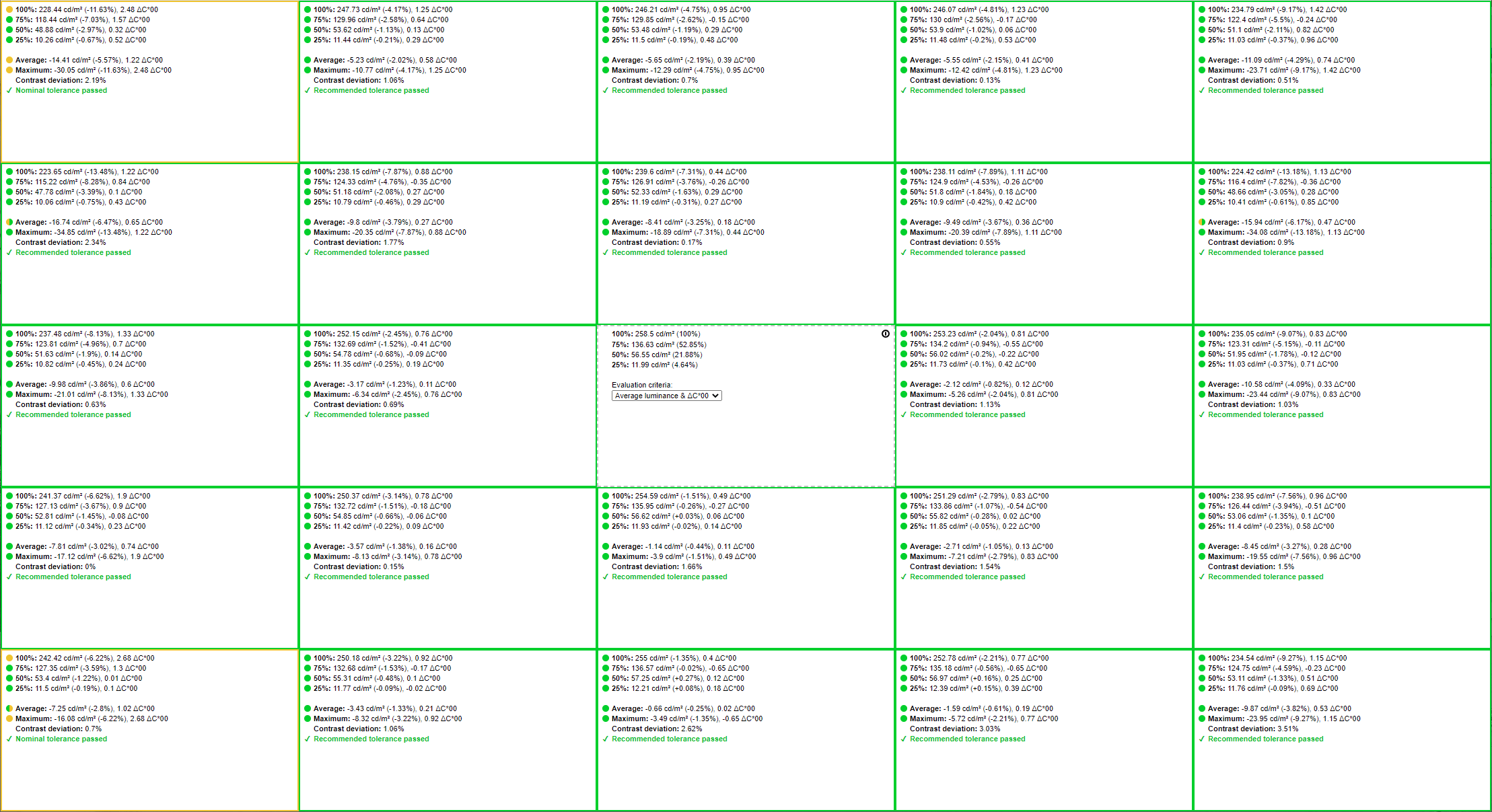 Panel uniformity is a test we run to check how uniform the luminance and color is across the entirety of the screen. During this test, the center square is used as the reference space. Every other square is then tested to see how far it differentiates from the reference.