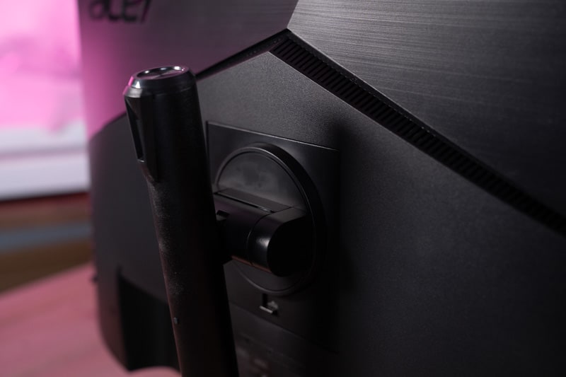 Moving to the rear of the monitor, we find a cylindrical stand that offers plenty of adjustment and versatility. The base of the stand provides a small hook for cable management, finished in an off-red coloring. The rear of the stand houses a two-tone aesthetic that is characterized by the brushed aluminum finish at the top. Acer’s logo can be seen in the top right-hand corner of the panel, with four buttons and a joystick found underneath – used for the OSD navigation. On the other side, users will find a couple of USB ports, allowing easy access for peripherals or charging devices.