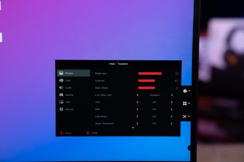 I had a look through some of the various presets available, but few were worth testing for color accuracy. The following presets are available; Action, Racing, Sports, User, Standard, ECO, Graphics, and HDR. This is fairly standard for Acer monitors, with many offering the exact same pallet to choose from.