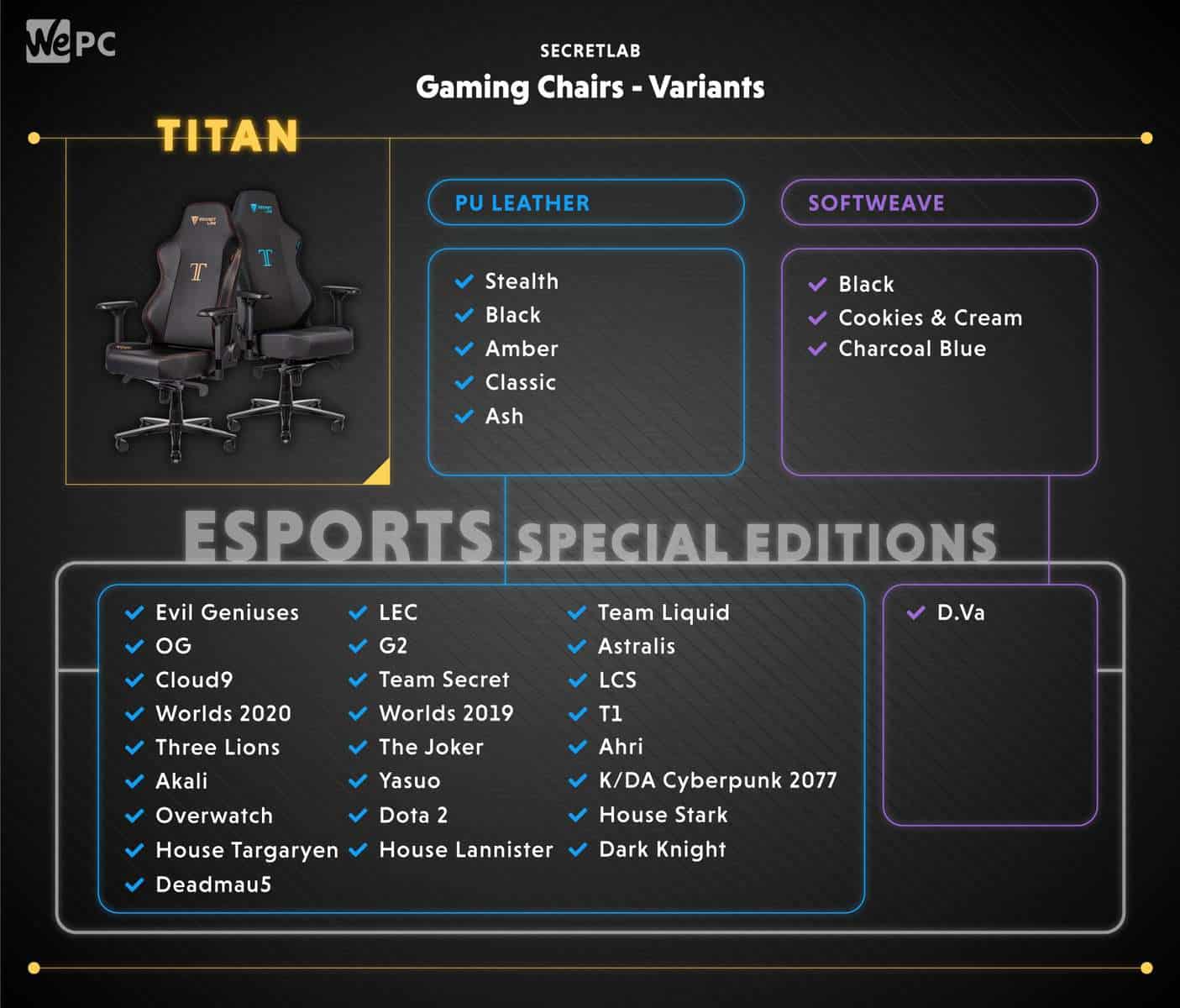 You can have the Titan upholstered in three different materials; 2.0 PU leather, NAPA leather, or SoftWeave fabric. The Secretlab Titan gaming chair is available in seven different color styles, as well as 13 different special editions.