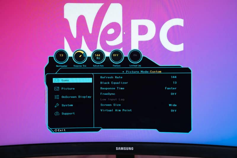 Before we started, we ensured the monitor was setup to what I considered the optimal settings. For me, that was maximum refresh rate (144Hz), pixel response time set to ‘Faster’ and FreeSync on. Setting the response time to the maximum would not only reduce brightness considerably but would also result in some overshoot occurring.