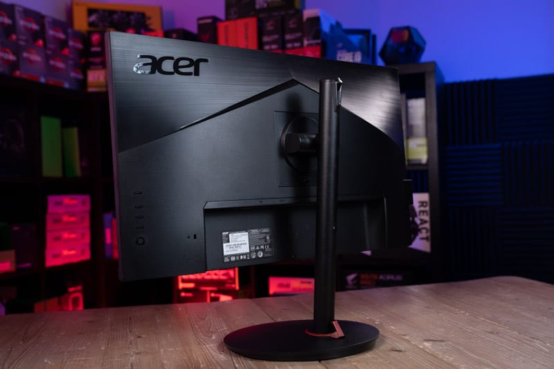 Moving to the rear of the monitor, we find a cylindrical stand that offers plenty of adjustment and versatility. The base of the stand provides a small hook for cable management, finished in an off-red coloring. The rear of the stand houses a two-tone aesthetic that is characterized by the brushed aluminum finish at the top. Acer’s logo can be seen in the top right-hand corner of the panel, with four buttons and a joystick found underneath – used for the OSD navigation. On the other side, users will find a couple of USB ports, allowing easy access for peripherals or charging devices.