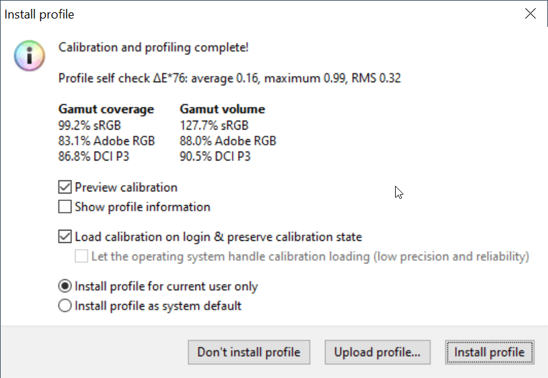 | Calibrated Profile | 6491K | 0.2223 cd/m² | 537.5:1 | 0.29 | 1.41 | 2.19 |