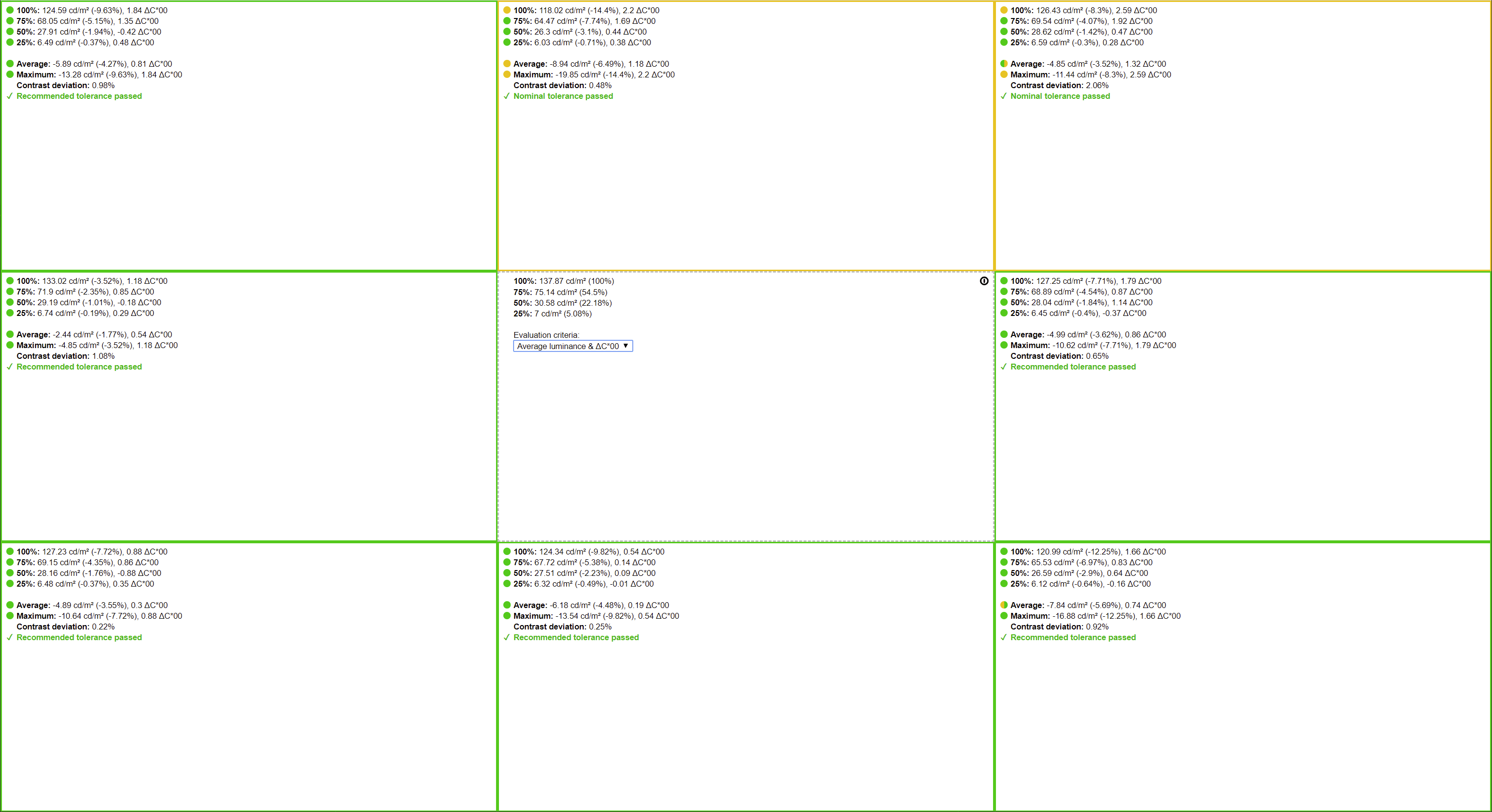 Panel uniformity is a test we run to check how uniform the luminance and color is across the entirety of the screen. During this test, the center square is used as the reference space. Every other square is then tested to see how far it differentiates from the reference.